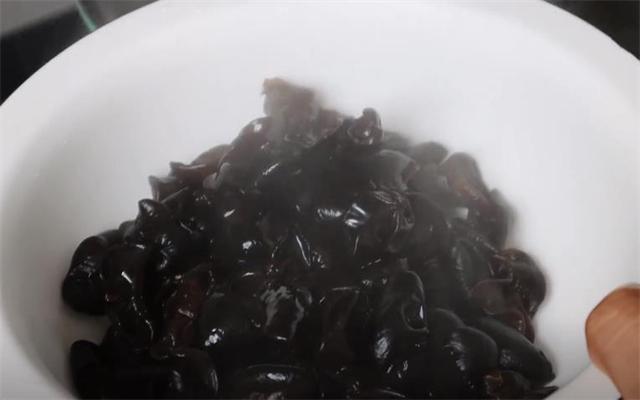 7.这会儿木耳浸泡好了,将木耳上的尘土冲洗干净,然后把木耳倒进开水锅里焯水,煮大约2分钟,将木耳煮熟,煮好的木耳控水捞出来备用。