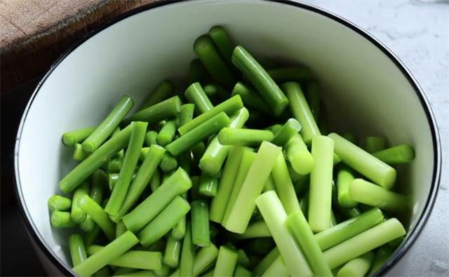 3.再准备一小把择洗干净的蒜苔,将蒜苔切成长段,蒜苔的营养成分也很高,和豆腐一起炒着吃,非常的不错,既能搭配颜色,又好吃下饭。