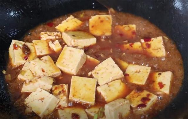 9.接下来锅里倒入油,油热以后先加入葱姜进去炒香,再加入一勺豆瓣酱进去翻炒,炒出豆瓣酱的香辣味,等炒出红油后 ,再加入刚才调好的料汁进去翻炒,将料汁炒匀、炒香,然后倒入豆腐进去,用铲子轻轻地翻动豆腐,不要用力过猛,把豆腐炒散了,烧2分钟左右,让豆腐吸收汤汁的味道,这样豆腐会更加的入味。