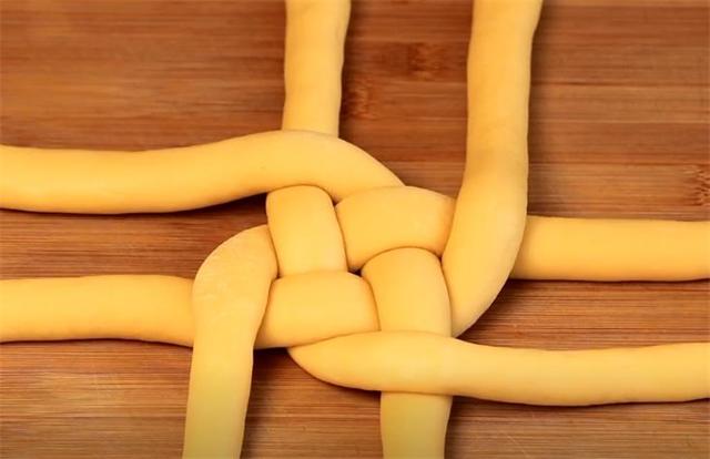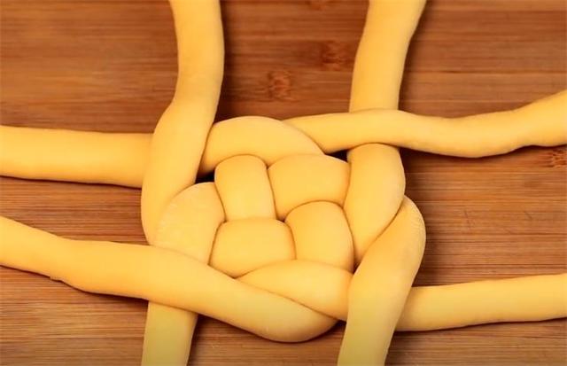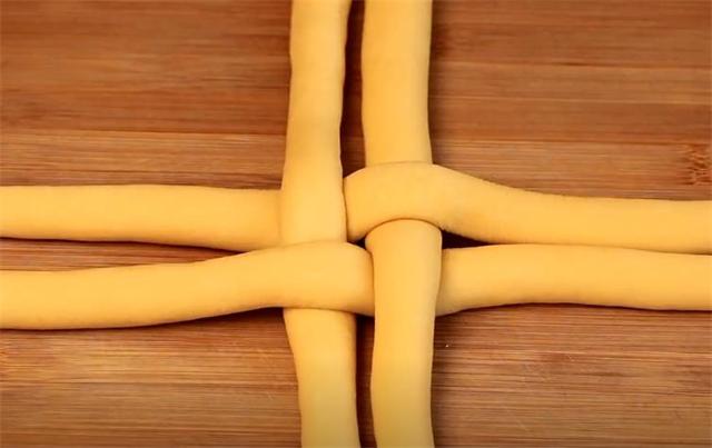 5.四个剂子揉圆后再揉成长条,把4根长条这样放一起。