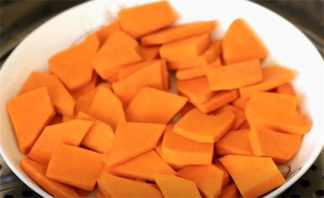 1.准备一小块南瓜,先把南瓜皮去掉,切成小块,上锅蒸熟。