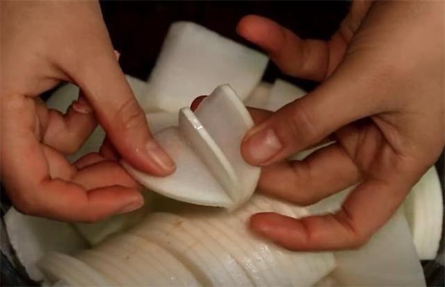 1.准备一个白萝卜切去头尾,然后分成四份,再切夹刀片,就是连着切两刀不要切断开,第三刀再切断,全部切成这个样子就可以了。