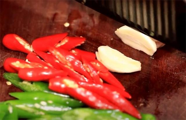 3.切点青尖椒,再切点红尖椒,大蒜切成蒜片。