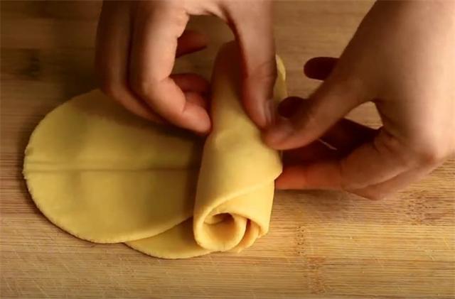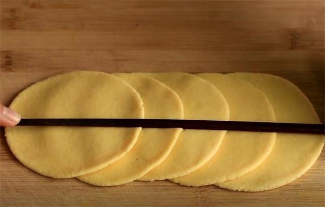 3.揉一下擀成薄面饼,把5张饼这样排在一起,用筷子在中间压一下。