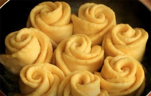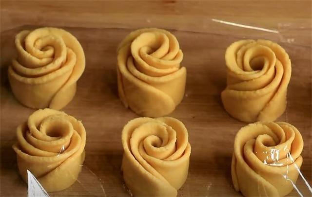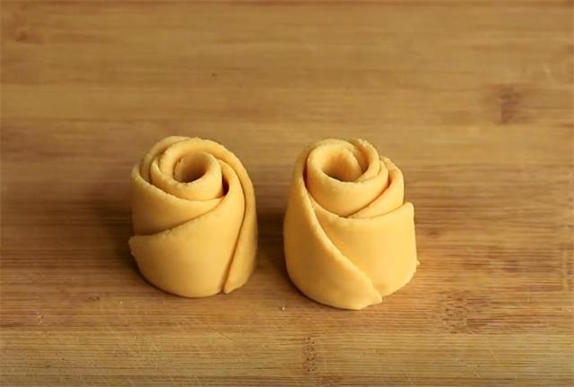 6.再把边缘整理一下,这样就做成了玫瑰花的形状,盖上保鲜膜醒发10分钟。