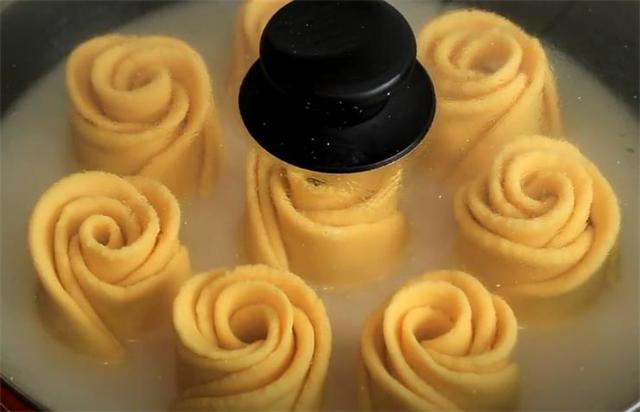 8.平底锅刷点食用油后放入玫瑰花卷,小火烙至底部金黄后倒入面粉水,盖上盖子小火焖煮10分钟左右。