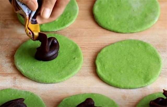 4.案板上撒些干面粉,面团醒好后揉成长条,再分成小剂子,来回揉匀后擀成薄的圆形面皮,在面皮上面再挤上豆沙。