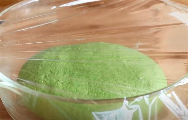 3.准备300g面粉,加入3g的酵母粉,菠菜汁边倒边搅拌,揉成面团后盖上保鲜膜醒发至两倍大小。