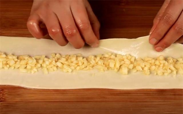 7.在案板上面抹层食用油防粘,小面剂子都揉成细长条,长条都再用擀面杖擀薄,放上苹果碎。