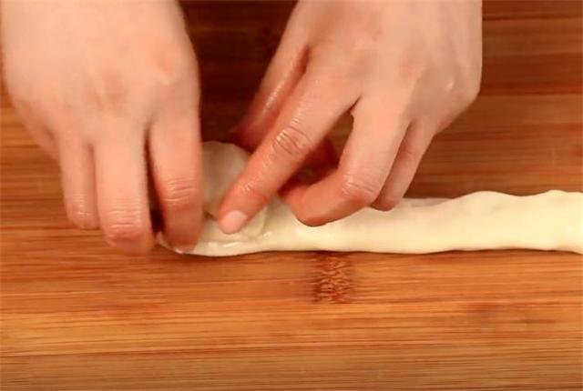 8.把苹果碎包起来,再把两头封紧后卷起来。