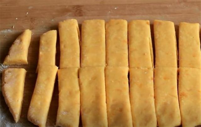 3.再加一勺面粉,搅拌均匀后揉成面团擀薄,用刀像这样切成小块。