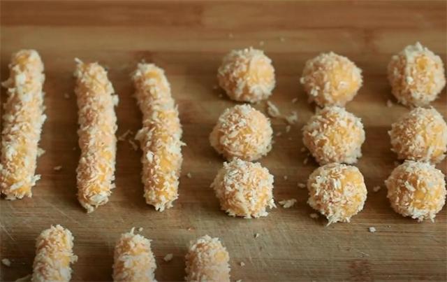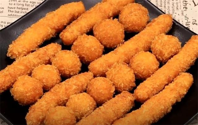 4.一半揉成长条状,另一半揉成圆球状,再沾点清水,均匀地裹上一层面包糠。