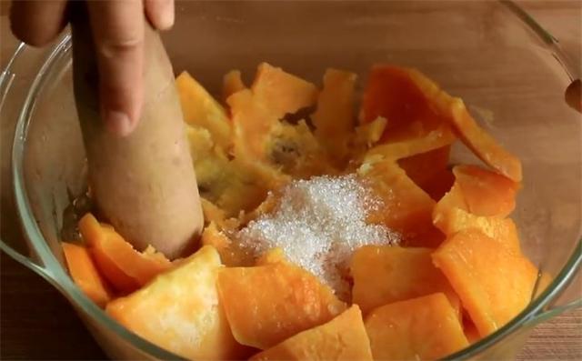 2.蒸熟之后取出,加两勺白糖用擀面杖捣碎成红薯泥。