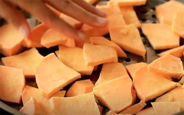 1.准备两个红薯,先削去皮,再切成小块,放蒸锅上蒸熟。