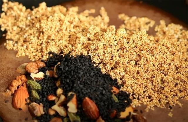 准备食材: 小米、食用油、白糖、干果、黑芝麻 具体做法: