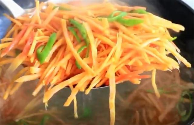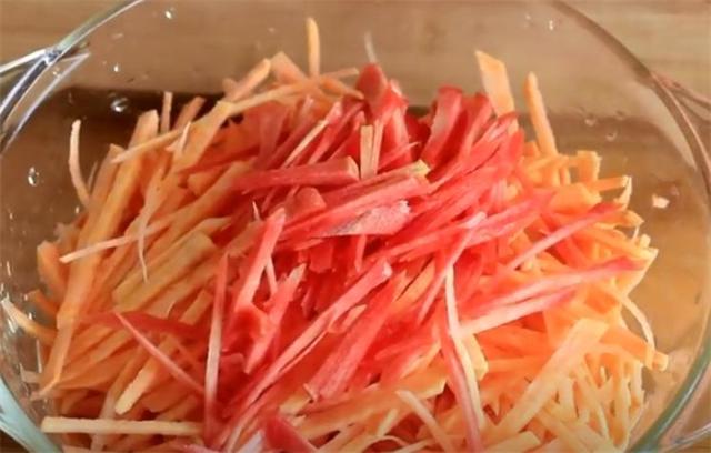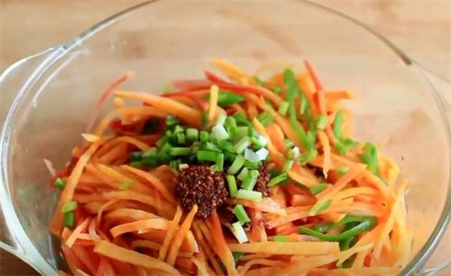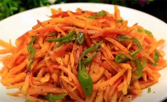 准备食材: 红薯、胡萝卜、青椒、盐、白醋、生抽、香油、辣椒油、葱花 具体做法:
