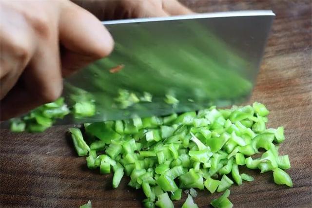 3.准备一个螺丝椒,把辣椒也切成小丁。