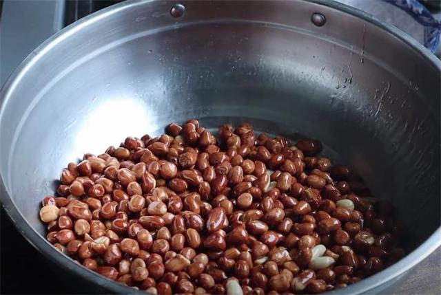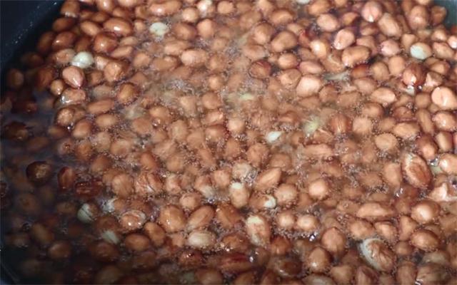 5.这会儿花生米控干水分了,然后把花生米直接倒入锅里面,再加入油进去,油的量刚好淹没花生米就可以,开小火,慢慢地炸花生米,随着锅里油温的升高,花生米才能由内到外慢慢地炸透、炸熟,炸的过程中,要多翻动翻动,让锅里的花生米都能够均匀地受热,这样炸花生米的时候不会出现外焦里生的现象,一直把花生米炸熟,炸到酥脆,炸到花生米有噼里啪啦爆开声响的时候就可以了。