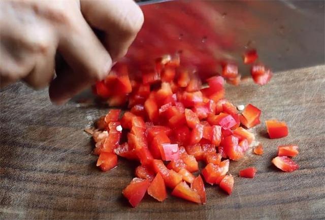 2.再准备一些需要的配菜,切半个红椒去籽,先切成粗一些的条,再全部切成小丁。
