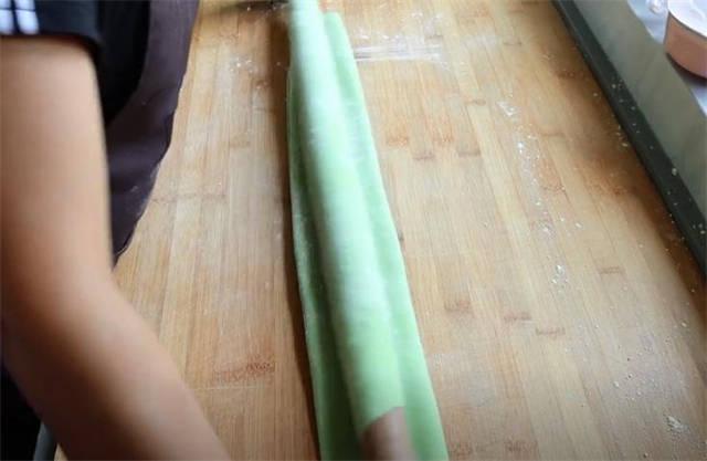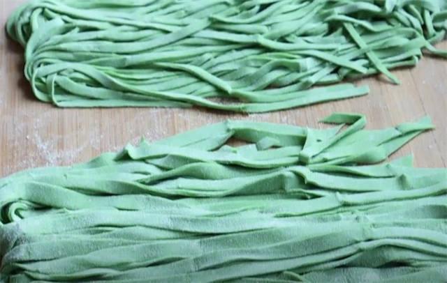 9.然后开始切面条,用刀全部切成宽窄相同的面条,喜欢吃宽面条的就切得宽一点,喜欢切细面条的就切得细一点,切好后抖散开,咱们这个菠菜手擀面就做好了,自己做的手擀面特别的劲道,也不会断。
