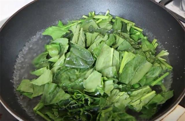 2.然后把切好的菠菜倒入开水锅里先焯一下水,这样不仅可以去掉菠菜本身的涩味,还能够除掉大部分的菠菜草酸,大约烫15秒左右,再把菠菜控水捞出来。