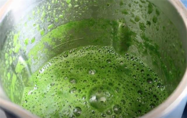 3.接着把焯过水的菠菜放入破壁机里面,再加入少量的水进去,打成菠菜汁,打好的菠菜汁放在一旁备用。