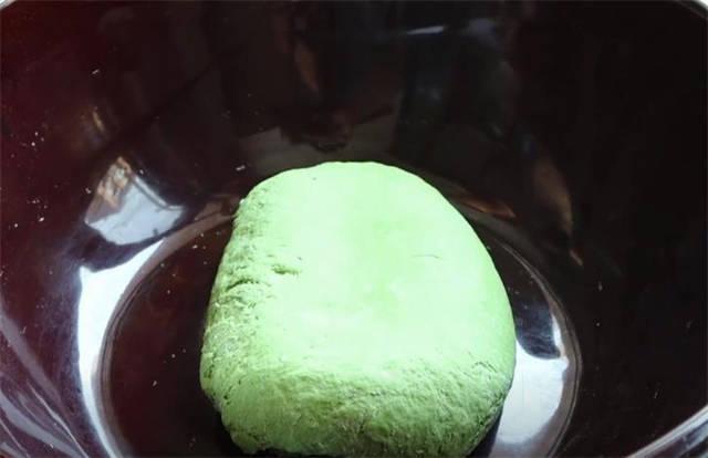 4.接下来开始和面,往盆里加入面粉,然后加入一勺碱面,再加入一勺盐,接着分次往盆里加入菠菜汁进去和面,直接用手来搅拌,一斤面粉大约加240g的菠菜汁,一直把面粉搅成面絮状的时候,再把它们均匀地揉在一起,揉成一个大面团,这会儿面团揉好了,用盖子盖住醒面半个小时。