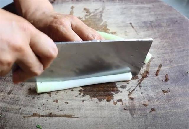 6.切一截葱段,全部切成葱花,再准备几个大蒜,先用刀把它拍扁,全部切成蒜末备用。