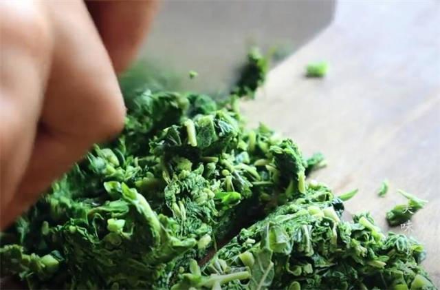 5.这个是我今年储存的香椿,今天我们来做香椿油泼面,刚好可以派上用场,先将这个香椿解冻开,然后把香椿全部用刀切得小一点。