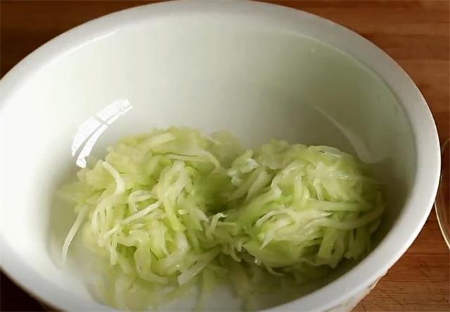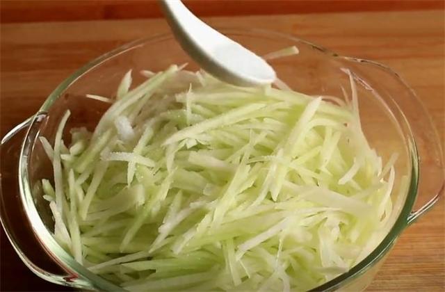 1.我们先把两个胖萝卜切头去尾,去皮后切成细丝,加一勺食盐抓匀后腌制10分钟。