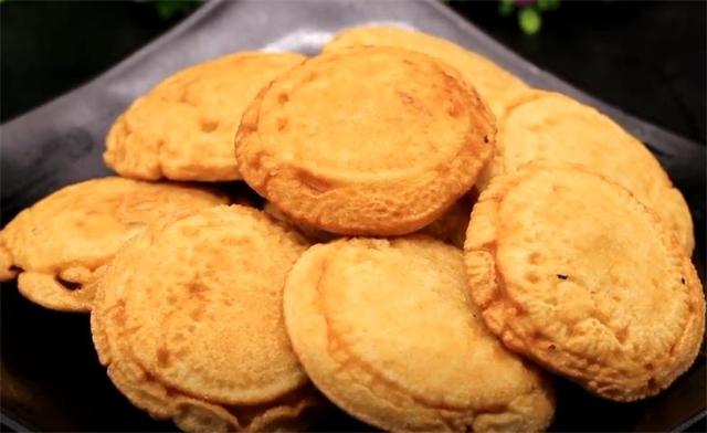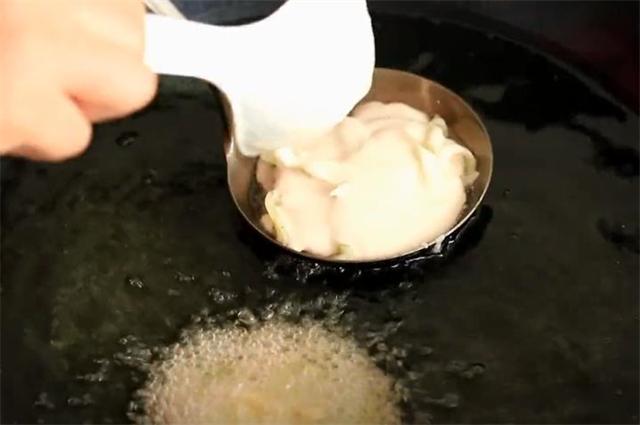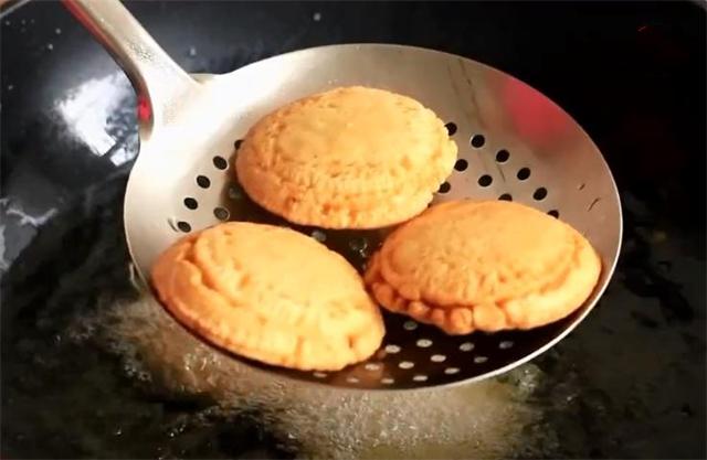 6.接着放进油锅里炸至定型,炸至焦黄后面饼与勺子会自动脱离,来回翻面炸至熟透。