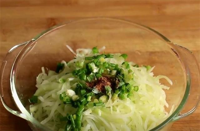 准备食材: 萝卜、盐、普通面粉、清水、葱花、五香粉、香油、食用油 具体做法: