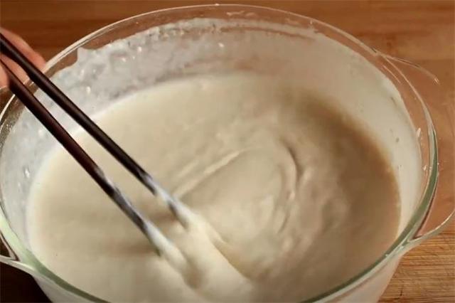 2.碗里加入300g面粉,450毫升的水边加边搅拌,搅拌成没有干面粉的稀面糊。