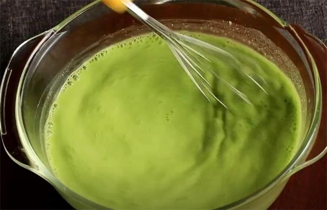 4.豌豆粉加大碗里,边加黄瓜汁边搅拌,搅拌到没有干豌豆淀粉就可以了。