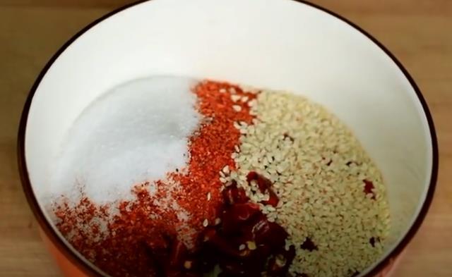 1.碗内加入炒熟的花生碎,干红辣椒段,辣椒粉,白芝麻,食盐。