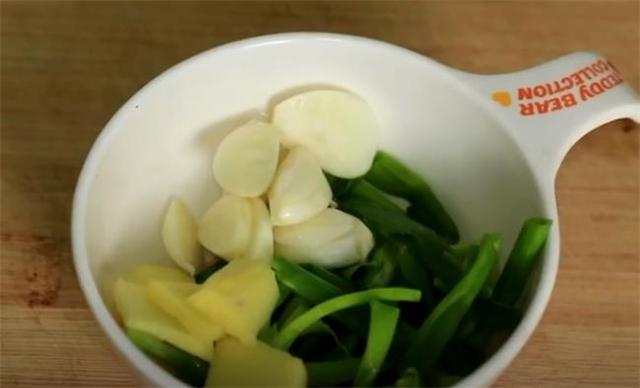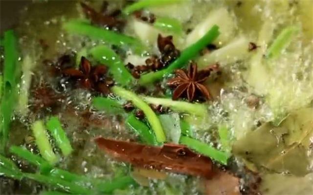 3.锅内加油后下入葱和姜,再把桂皮、香叶、八角和花椒加进去炸香。