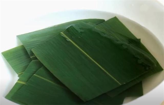 2.粽叶用开水泡过后剪成小块。