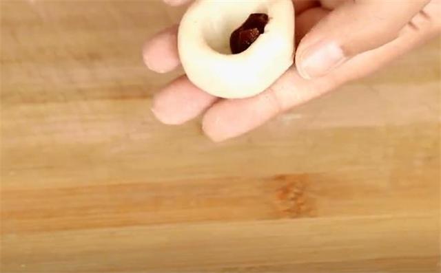 3.取一点面剂揉圆,手指轻轻转个小窝包上豆沙馅。