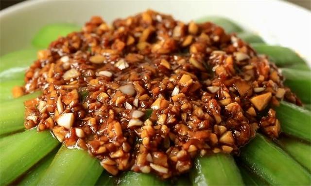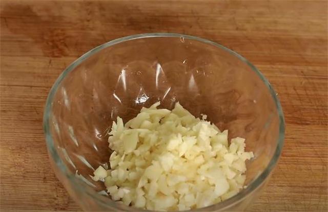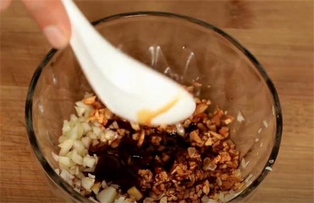 6.锅留底油倒入一半的蒜末,炒至金黄色装入碗中,加入一勺生抽,半勺素蚝油搅拌均匀。