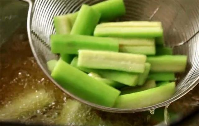 5.锅中加油,油温六成热炸至丝瓜变色捞出。