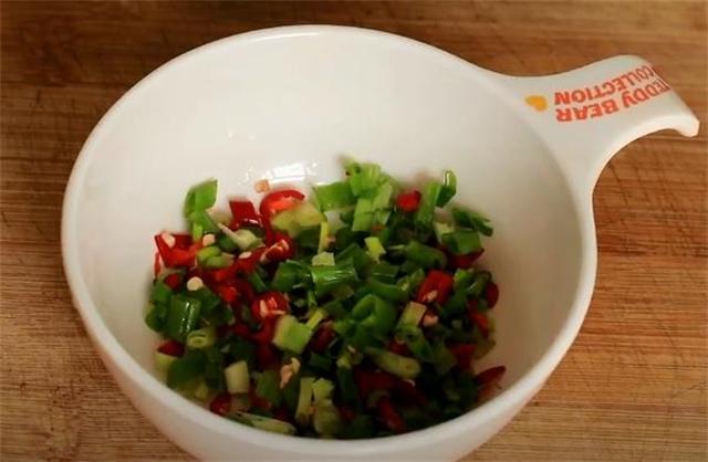 4.香葱只取葱叶切成葱花,小米椒切碎。