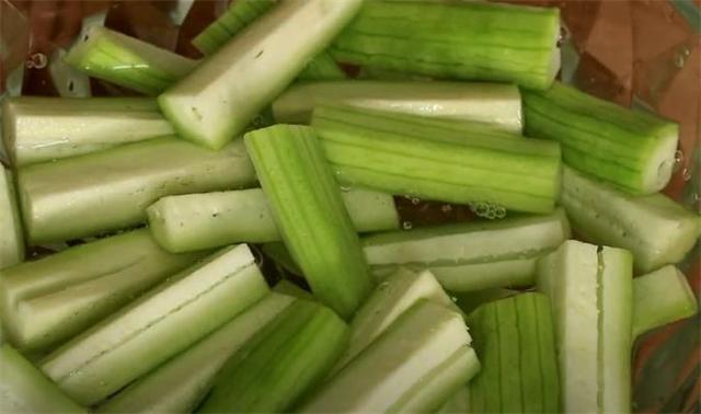 1.丝瓜先去皮,然后切成小段,再切成细长条,泡到凉水里,防止变黑。
