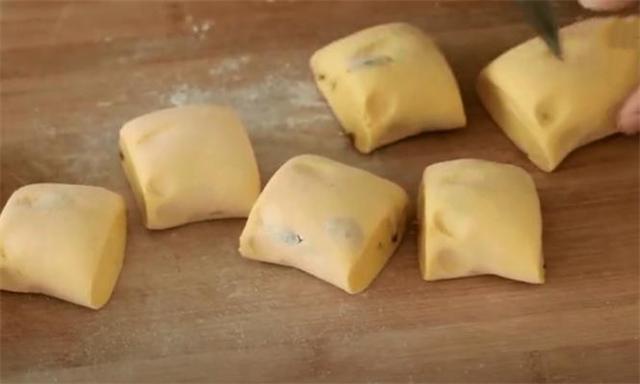 3.案板上撒些干面粉,醒好的面团揉成长条切成小块。