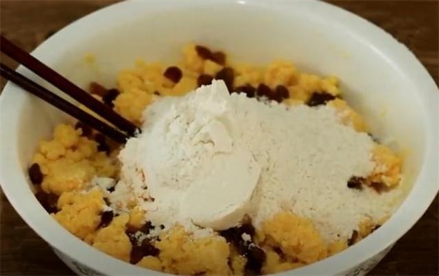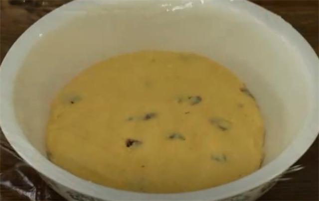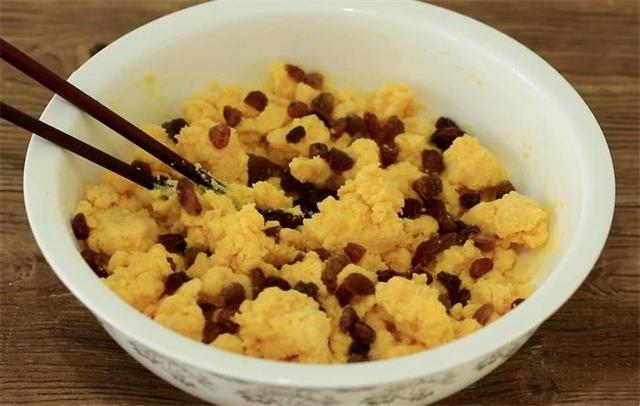 1.碗内加500g玉米面,用开水烫玉米面,烫到没有干面粉后加葡萄干,加一勺白糖,100g面粉。
