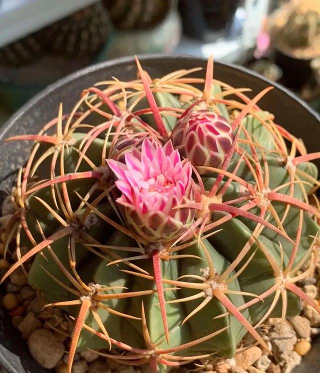 所以养君子兰的人都知道,一定要先养好花根才行。因此,在浇水方面,要非常谨慎,尤其是不能向叶片上喷水,因为它的这种结构容易导致叶芯中聚集水分,无法蒸发,从而引起叶片腐烂。若是发现叶片上的灰尘很大,可以用干净湿润的毛巾去擦一擦,去除灰尘,还可以补充水,并且提亮叶片。 第二种,仙人球 仙人球的外形很独特,球体被很多硬刺覆盖,所以让人不敢轻易靠近,但其实仙人球是一种娇妹子,在夏天可以肆意开花,每个小花朵都像多彩的喇叭,让这个夏天也变得热闹非凡。