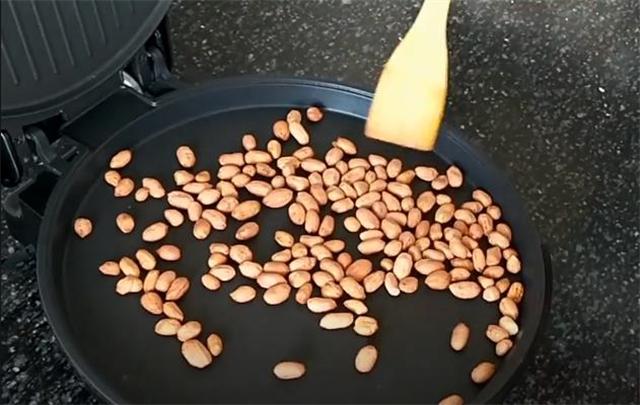 1.先把花生米在电饼铛上烤熟,这样做的花生米更脆更香不易糊。