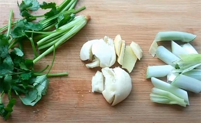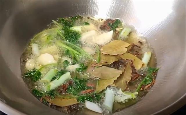 5.锅内加入适量的食用油,放入葱姜蒜和香菜,再依次加入八角、桂皮、香叶和花椒炸香。