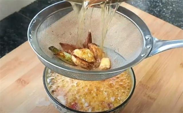 6.炸出香味以后用过滤网把热油淋入碗中。