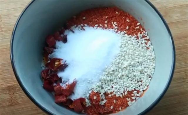 3.放入炒好的干红辣椒段,加入辣椒面,少量的白芝麻,一大勺食盐。