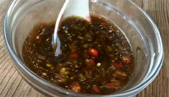 4.切两个小米椒,放到碗里,加半勺食盐,六勺香醋,适量凉开水,再加半勺小磨香油搅拌一下。